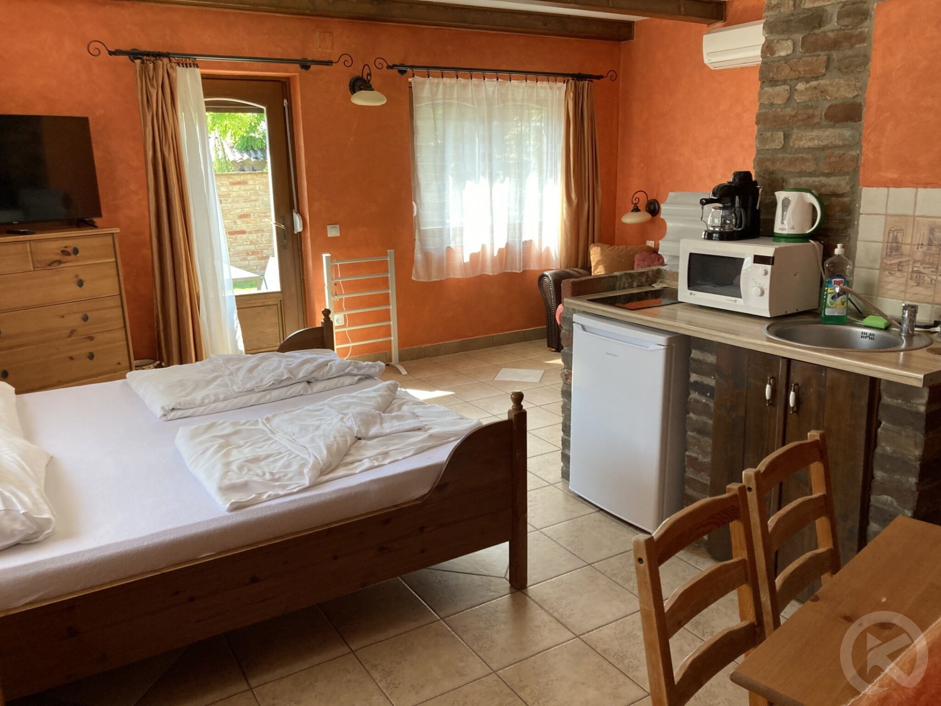 Marcsi Apartmanok offers two modern, fully equipped apartments, perfect for families, couples, or small groups of friends. The upstairs 35 m² apartment features a balcony, while the ground-floor 32 m² apartment boasts a private terrace with views of the well-maintained garden. Both apartments come with separate entrances, air conditioning, free Wi-Fi, and flat-screen TVs, ensuring maximum comfort. The property is wheelchair-accessible, and small pets up to 10 kg are welcome.