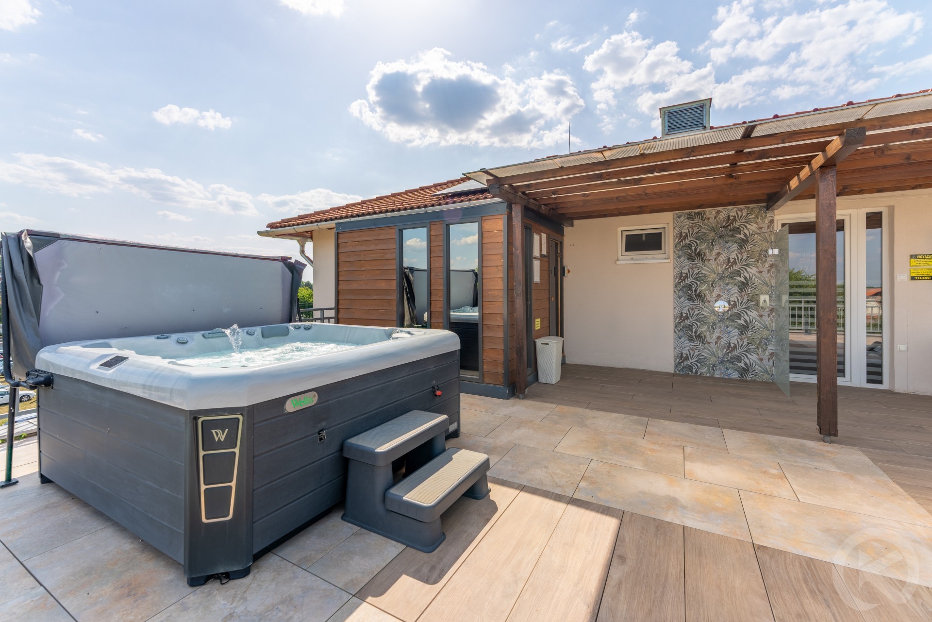 Wellness Terrace: Jacuzzi (1500 HUF/hour, 33–35 °C), sunbathing terrace.