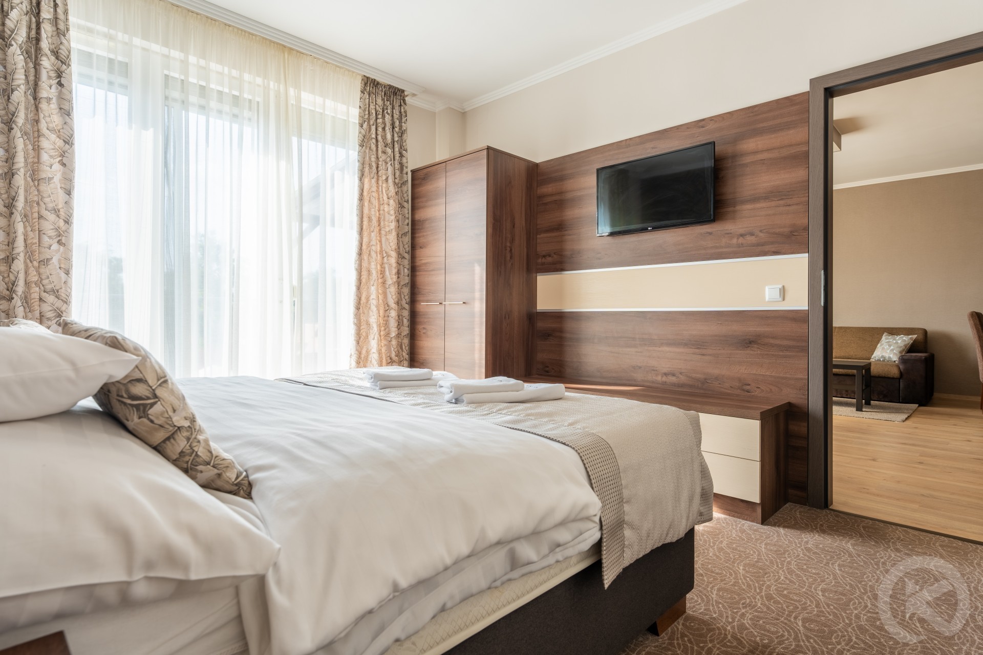 Solaris Apartman & Resort features 9 apartments with a total capacity of 18 beds, catering to various needs. The apartments can accommodate 2 to 6 guests, making them ideal for couples, families, or groups of friends. Standard and superior apartments host up to 4 people, while family apartments and the penthouse suite accommodate up to 6. Spacious living rooms with pull-out sofas provide extra sleeping space.