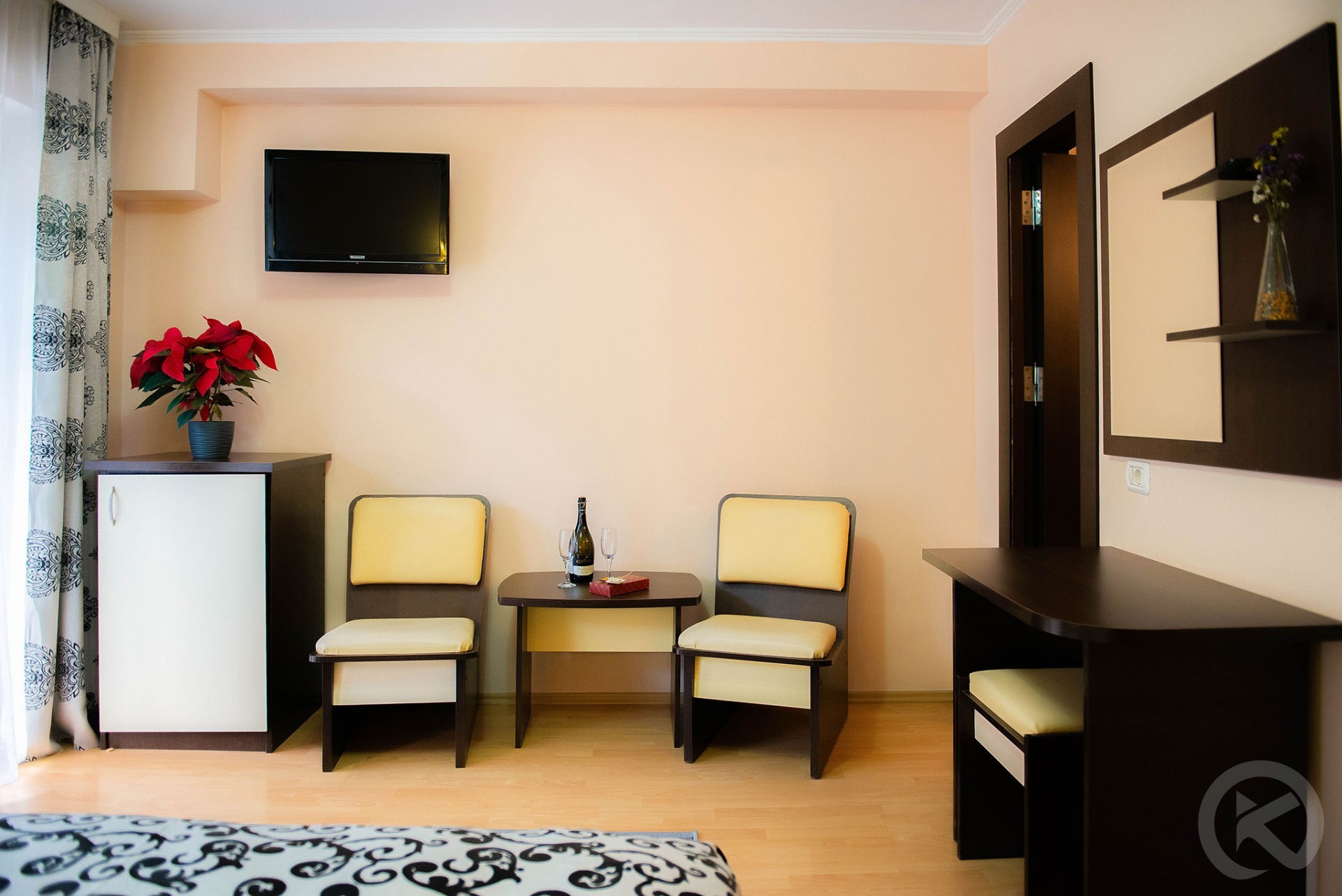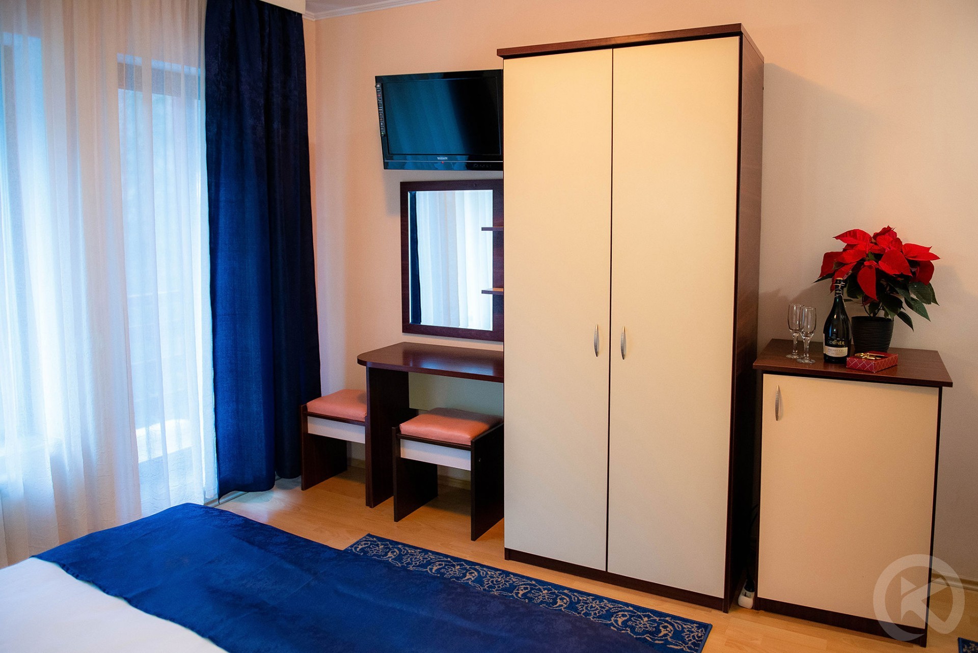 Floors 1 and 2: double rooms with private bathrooms, flat-screen TVs, desks, hairdryers, and some with balconies.